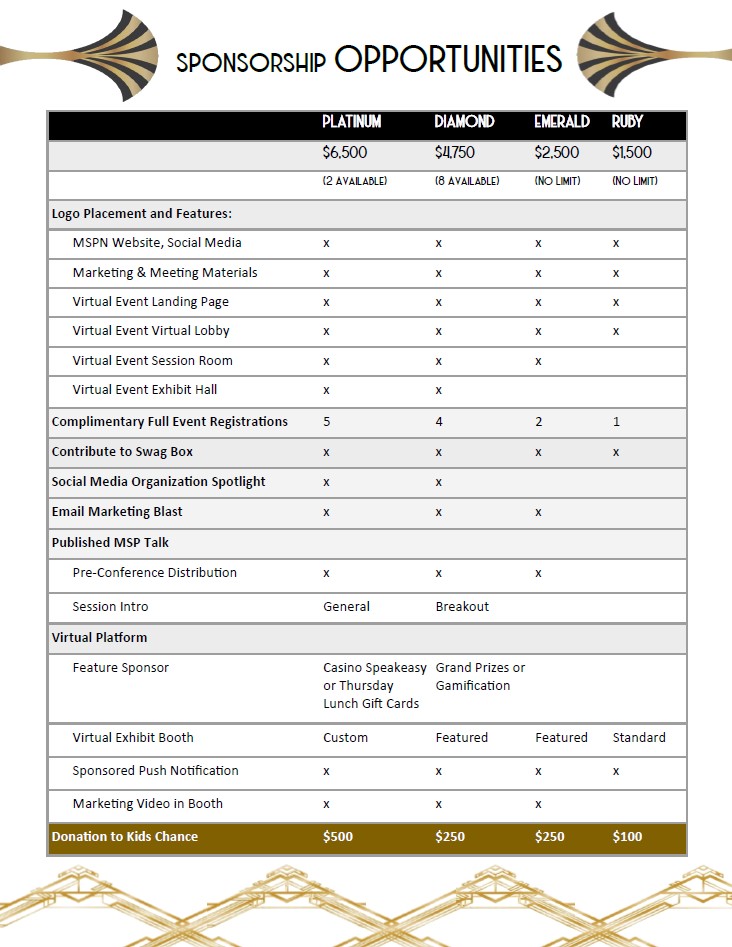 Email Marketing Blast MSPN will facilitate a blast e-mail to conference attendees from sponsor (the email message should be about the company’s participation in the conference, should provide value to the attendees, and will be limited to 500 words. Content due to MSPN by September 1, 2021. (Benefit offered to Platinum, Diamond, and Emerald sponsors only.)